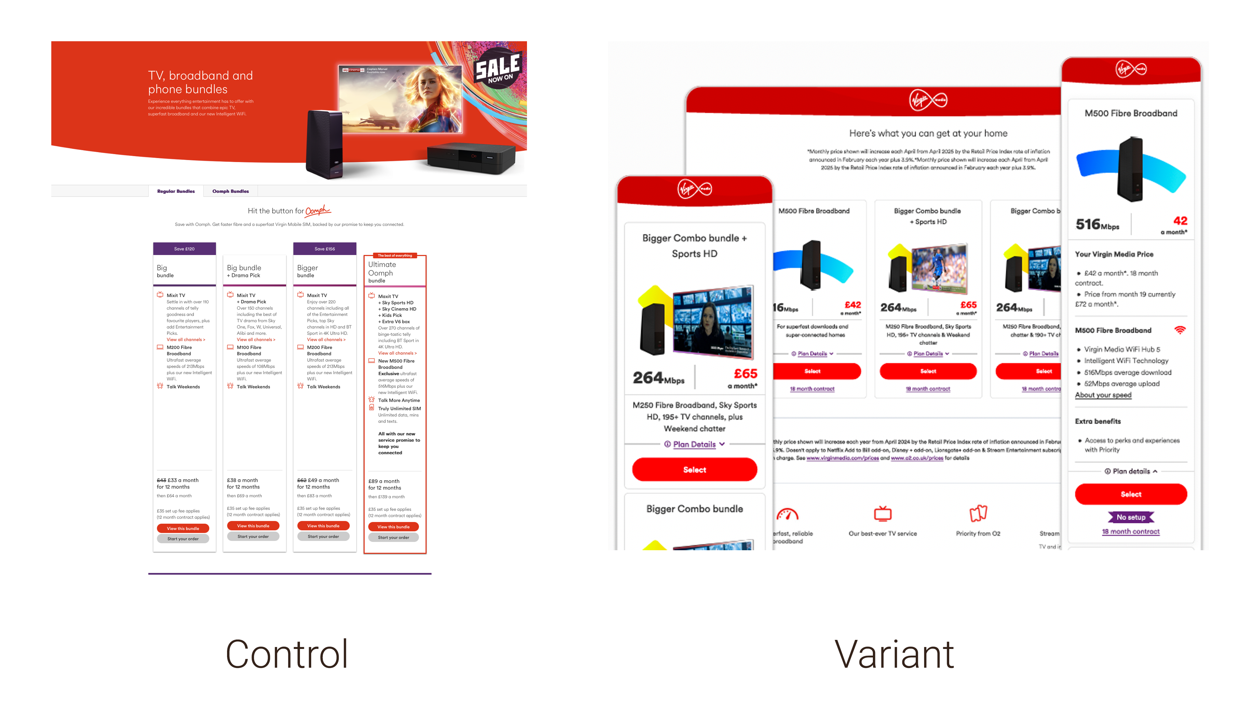 Another A/B test I led focused on redesigning Virgin Media's product cards, which as is the case with many telco's, were long, detailed and very hard to understand. By incorporating product-specific imagery and streamlining the information architecture, we enhanced the visual appeal and established a clearer content hierarchy. This allowed users to compare bundles more easily based on content and pricing, improving overall engagement and user experience.